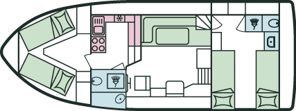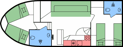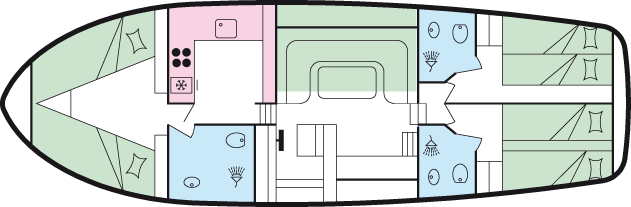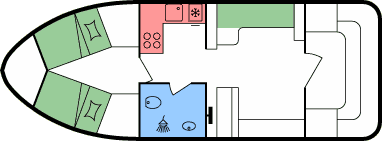 - Doppel- oder 2 Einzelbetten in den hinteren Kabinen