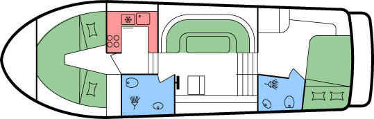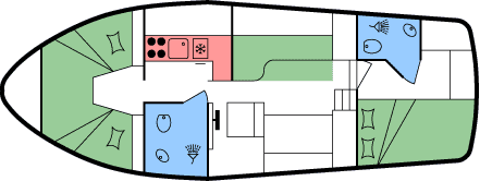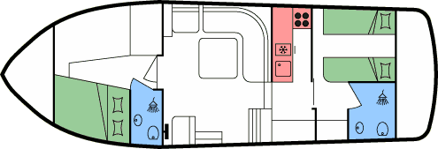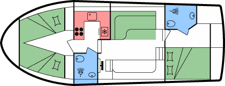- Je 1 Doppel- oder 2 Einzekbetten in den beiden Heckkabinen