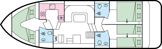 - In den Bug- und den beiden Heckkabinen je ein Doppel- oder zwei Einzelbetten