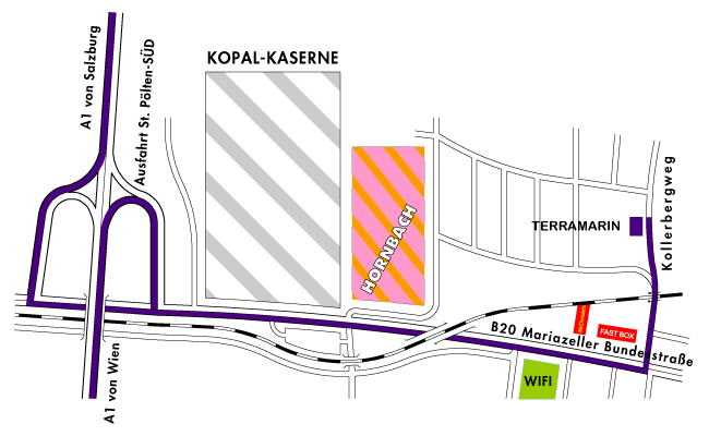 Sie nehmen die Abfahrt St.Pölten-Süd, biegen links ab Richtung Zentrum und fahren bis zur sechsten Ampel (McDonald's) und reihen sich zum Linksabbiegen ein.
